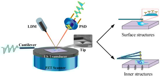 To obtain the internal structure information of samples and their morphological surface characteristics simultaneously, we combined an ultrasound transducer to a commercial AFM platform and built an atomic force acoustic microscopy system, as shown in Figure 1. Similar to AFM, the surface morphology of samples were acquired via the displacement of a cantilever with a sharp probe tip at its end. As the tip scanned along the specimen surface, a laser beam from the laser diode module was reflected by the cantilever oscillating accordingly and caught by the position-sensitive detector. This AFM-like system operated in constant force mode, where the piezoelectric scanner manipulated the sample holder up and down to maintain the laser spot at the center of a position-sensitive detector. During AFM morphological measurements, an ultrasound transducer attached to the piezoelectric scanner emitted single-frequency acoustic waves that travelled vertically upwards through the sample. This transmitted ultrasound then irradiated the probe tip with high-frequency vibrations, which could be recorded to recover the changes in the amplitude and phase of the longitudinal acoustic wave. Two-dimensional distributions of acoustic amplitudes and phases mapped the delicate surface and internal structures. The silicon tip had a diameter of approximately 10 nm at the pinpoint and could therefore ideally detect surface changes at a 10 nm scale. In our preliminary work, we imaged 20 nm gold nanoparticles buried in a 500 µm polymer cover layer. The particles and their three-dimensional distribution are clearly visible in our acoustic images [23].