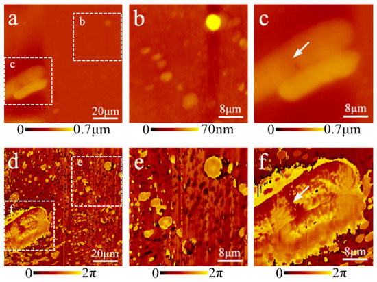 Correlation of AFAM phase images with morphology: (a) morphological image of E. coli; (d) phase image; (b) morphological image with 100 times enhancement of the contrast; (e) corresponding domain in the phase image with enhanced effects to show the mild structures, including a very bright spot and several dots arranged along a nearly straight line across the figure; (c) morphological image of the E. coli body structure appeared as a small thin region in the middle’ and (f) corresponding domain in the phase image showing more details, including a larger distinct fuzzy area, as indicated by the arrow. The phase image emphasized faint details and indicated subcellular structures inside cells.