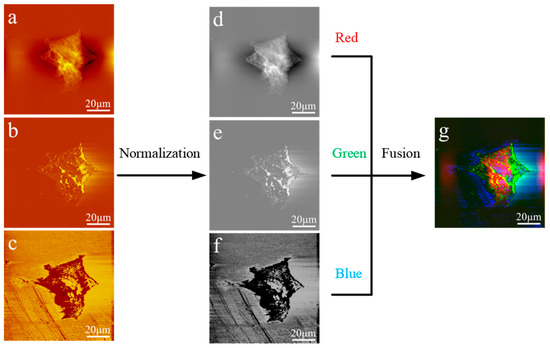 The Fusion method schematic diagram: (a) morphological image of an MCF7 cell; (b) amplitude image; (c) phase image; (d–f) the source images normalized to create a histogram at the 0–255 level; and (g) fused image. The morphological image was taken as the red channel, the ultrasound amplitude image as the green channel, and the ultrasound phase image as the blue channel of RGB. The fused image showed all the information of the original images in a comprehensive and colorful presentation.