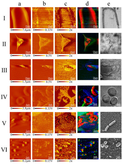 Figure 6 presents an atlas of morphological images, amplitude acoustic images, phase images, fused images and reference images of the six cell types. We obtained typical optical images of plant cell and animal cells (Figure 6Ie–IVe) and SEM images of bacteria (Figure 6Ve,VIe) as references.