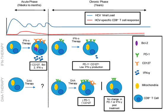 HCV-specific Immune Restoration following IFN and DAA therapy administered during the acute and chronic phase of HCV infection. HCV is characterized by an acute phase of infection in which the immune response is unable to control HCV replication, leading to chronicity in the majority of patients. Following IFN-α therapy administered during acute HCV infection: CD8+ T cell populations expressed low levels of exhaustion marker, PD-1 and increased levels of memory marker CD127, anti-apoptotic marker Bcl-2 and IFN-γ production. Following IFN-α therapy administered during chronic HCV infection: CD8+ T cell populations expressed high level PD-1 and low level of CD127 and IFN-γ production. Immune restoration following DAA therapy administered during acute HCV infection has not been documented in the literature. Following DAA therapy administered during chronic HCV infection: Literature demonstrates varying results. Decreased PD-1 and increased CD127 has been reported, while no change in PD-1 expression post-treatment has also been reported.