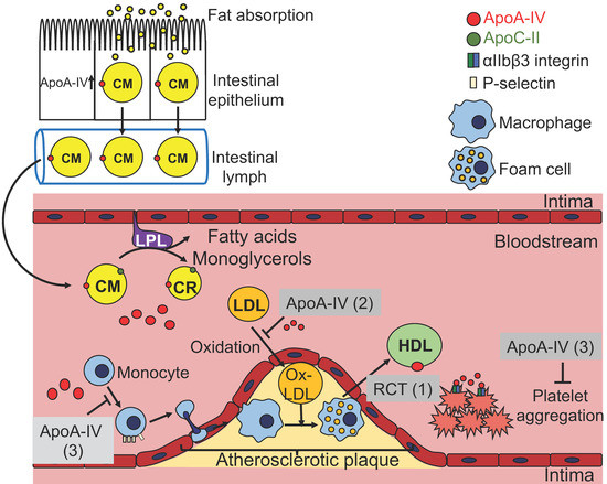 The metabolism of apoA-IV-containing lipoproteins and possible anti-atherogenic mechanisms related to apoA-IV. Upon fat absorption, apoA-IV is synthesized, secreted together with chylomicrons (CM) and transported via lymphatic system to bloodstream. In the circulation, apoA-IV promotes the activity of lipoprotein lipase (LPL) in the presence of apoC-II. Most apoA-IV dissociates from chylomicron remnants (CR) and 25% of them are transferred to high-density lipoproteins (HDL), while the rest are circulating in lipid-free state. (1) ApoA-IV is involved in reverse cholesterol transport, likely by activating LCAT activity and facilitating cholesterol transport from foam cells or other peripheral cells to HDL. (2) ApoA-IV can reduce the production of oxidized low-density lipoprotein (Ox-LDL), which is constantly taken up by macrophages to form foam cells. (3) ApoA-IV acts as anti-inflammatory agent likely by suppressing P-selectin-mediated leukocyte and platelet adhesion to endothelial cells. It also interacts with αIIbβ3 integrin and inhibits platelet aggregation.