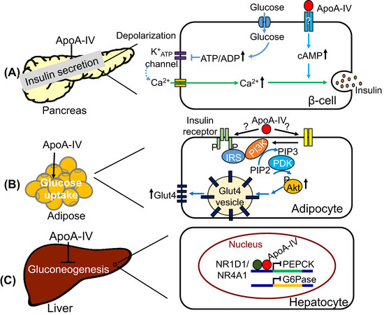 ApoA-IV improves glucose homeostasis. (A) ApoA-IV acts downstream of Ca2+-dependent insulin secretion likely via cAMP pathway. (B) ApoA-IV activates PI3K-mediated Akt phosphorylation and eventually promotes Glut4 translocation to the plasma membrane for glucose uptake in adipocytes. (C) ApoA-IV interacts with NR1D1 or NR4A1 in the nucleus to downregulate the expressions of PEPCK and G6Pase, which are involved in hepatic gluconeogenesis.