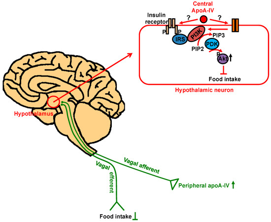 The regulation of food intake by apoA-IV. ApoA-IV expressed in the central nervous system suppresses food intake via PI3K/Akt pathway in the hypothalamic neurons. The signal elicited by peripheral apoA-IV is relayed to the brain by vagal nerve to inhibit food intake.