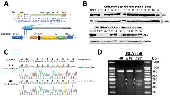 The CRISPR/Cas9 with T2A-eGFP co-expression vector pSpCas9(BB)–2A-GFP (PX458) was a gift from Feng Zhang (Addgene plasmid). The exon 1 of GLA was selected for guiding RNA design and the sequence (5′-AGGAACCCAGAACTACATCT-3′) was cloned into PX458 (abbreviated as GLA-Cas9-GFP) as previously described []. The GLA-specific targeting plasmid was transfected into hESC line (WA09) by electroporation using Nucleofector System (Lonza, Basel, Switzerland) following the manufacturer’s protocol. Briefly, hESC cells were cultured to 80–90% confluence, then harvested and washed with PBS without Ca2+ and Mg2+. Approximately 4 × 105 cells were resuspended in the pre-mixture solution with 2 μg GLA-Cas9-GFP plasmid, and the optimized protocol (program B016) was used for electroporation. The cells were plated on Matrigel-coated 6-well plate in mTeSR1 medium containing 10 μM Y27632. 48 h later, the proportion of cells expressing EGFP was enriched by flow cytometry using FACSCalibur (BD Biosciences, San Jose, CA, USA). Three days later, cells were detached with TrypLE (Invitrogen, Thermo Fisher Scientific, Waltham, MA, USA), separated into single cells and seeded with a density of 1 cell/well of a 96-well dish.