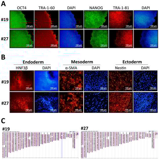 First, the cells were rinsed in PBS and fixed with 1% (v/v) paraformaldehyde for 10 min followed by treatment with 70% ethanol (v/v) for 10 min at room temperature. The cells were permeabilized with 0.1% NP-40 (Sigma-Aldrich, St. Louis, MO, USA) for 20 min, then washed twice with PBS. To block cells, blocking solution (0.3% BSA and 5% serum in PBS) was applied for 30 min. Cells were incubated with primary antibodies in the blocking solution overnight at 4 °C, washed three times in PBS, then stained with secondary antibodies at 1:200 in PBS for 1 h at room temperature. Cells were washed three times in PBS, and nuclei were stained with Hoechst 33,342 (Life Technologies, Thermo Fisher Scientific) at 1:5000 in PBS for 5 min at room temperature. Prior to imaging, cells mounted with SlowFade Gold Antifade Mountant (Millipore, Sigma, Burlington, MA, USA). Images were obtained using fluorescent microscopy and a digital camera. Antibody for characterization of pluripotency is listed in Supplementary Table S3.