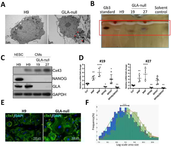 Given the fact that CM hypertrophy is one of the symptoms of FD-associated cardiomyopathy, we examined whether GLA-null CMs could recapitulate such features. hESCs were differentiated into CMs according to the conventional CM differentiation protocol []. Both GLA-null CMs and CMs derived from the parental H9 hESCs (H9 CMs) exhibited spontaneous contractions as early as twelve days following initiation of cardiac differentiation. Noticeably, no significant differences in the efficiency of cardiac differentiation were observed between GLA-null CMs and H9 CMs, which suggested that the GLA deficiency did not significantly affect the differentiation of hESCs to CMs. The accumulation of Gb3 in CMs is the most prominent hallmark of FD-associated cardiomyopathy. Compared with H9 CMs, GLA-null CMs accumulated more Gb3, as was demonstrated by transmission electron microscopy (Figure 3A) and thin layer chromatography (Figure 3B). GLA protein was not expressed in #19 and #27 GLA-null CM clones at day 60 of differentiation (Figure 3C). Cardiac hypertrophy is often accompanied by reactivation of fetal genes which are active during fetal cardiac development and quiescent in adult hearts []. We measured the expression level of several of such genes by qRT-PCR and showed that atrial natriuretic peptide (ANP), B-type natriuretic peptide (BNP), but not troponin T (TnT) were upregulated in GLA-null CMs compared to H9 CMs. In addition, GLA-null CMs were characterized by shifted balance between α- and β-cardiac myosin heavy chain (MYH6/MYH7 ratio) expression, which is a common response to cardiac injury and a hallmark of cardiac hypertrophy [] (Figure 3D). Immunofluorescent staining of cardiac troponin T (cTnT) revealed that GLA-null CMs were of significantly larger size (26% ± 9.7%, p < 0.001) as compared to the control H9 CMs (Figure 3E,F), which was consistent with the phenotype of FD-associated cardiomyopathy. In summary, we have shown that CRISPR/Cas9-edited hESC-derived GLA-null CMs recapitulated the typical phenotype features of FD-affected CMs and, therefore, could be a useful model to study the FD-associated cardiomyopathy.