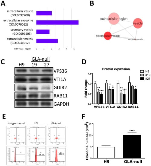 To further investigate the potential mechanism of FD-related cardiomyopathy, we used proteomic analysis. We focused our analysis to the genes that where downregulated by GLA knockout, i.e., whose function was negatively affected. By applying LC-MS/MS, we identified 60 proteins downregulated in GLA-null CMs as compared to H9 CMs with a false discovery rate (FDR) below 0.01. By performing gene ontology (GO) analysis using FatiGO software [], we found that these 60 proteins were significantly enriched in cellular component GO terms related to extracellular vesicle transportation, secretion, and exocytosis (Figure 4A,B). Among the downregulated proteins involved in regulated exosome release were Ras-Related Protein Rab-11 (RAB11), Rho GDP-dissociation inhibitor 2 (GDIR2, ARHGDIB), VPS36 and VTI1A (Supplementary Table S4). The levels of these proteins were validated and quantified by western blotting; they were shown to be downregulated in GLA-null CMs (Figure 4C,D).