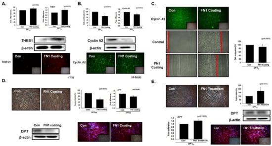 To determine the compensatory effect of FN1 with DPT, DPTkd cells were cultured in 10% FBS with or without FN1 coating for 1 h. Enhanced cell adhesion with increased THBS1 gene expression was found in DPTkd cells cultured in FN1 coated plates, relative to the non-coated plates (Figure 5A). Likewise, DPTkd cells were cultured for 4 days in FN1 coated plate for proliferative analysis. Compared to cell adhesion, a decreasing trend in cell proliferation with reduced Cyclin A2 expression was found in DPTkd cells cultured in FN1 coated plates (Figure 5B). Additionally, decrease in the cell migration rate with reduced Cyclin A2 expression, and reduced myotube formation with decreased DPT mRNA and protein expressions were observed in DPTkd cells cultured in FN1 coated plates (Figure 5C,D). Interestingly, increases in the myotube formation with increased DPT mRNA and protein expressions were observed in DPTkd cells supplemented with FN1 (Figure 5E). Here, we postulate the robust compensatory effect between FN1 and DPT, which highlights the importance of their expression with respect to regulation in the myogenic program.