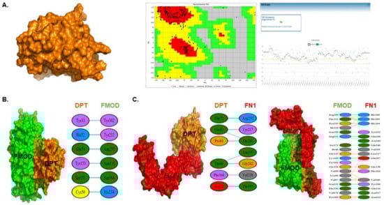 Protein-protein interaction (PPI) between DPT-FMOD, DPT-FN1, and FMOD-FN1 explored the binding efficacy of these proteins in terms of global energy. The global energy for ‘DPT-FMOD’, ‘DPT-FN1’ and ‘FMOD-FN1’ interactions predicted by the FireDock server were found to be −41.66, −32.73, and −60.09 kcal/mol, respectively. The interacting amino acid residues in these PPI reveals that the number of hydrogen bonds and hydrophobic interactions are maximum in the FMOD-FN1 interaction with the highest binding energy, while the interaction of DPT with FMOD and FN1 is not as robust (Figure 7B,C).
