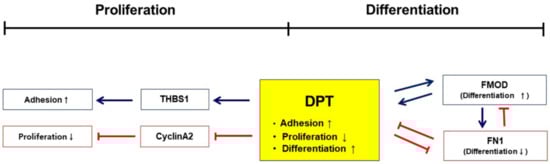 Summarizing the outcomes of this study, we constructed a scheme (Figure 8) which visibly demonstrates that: (1) DPT is actively involved in the myogenic program as it increases cell adhesion, decreases cell proliferation, and enhances differentiation; (2) DPT and FN1 show inhibitory effects to each other in the myogenic milieu; and (3) DPT and FMOD positively regulate each other and enhance muscle differentiation.