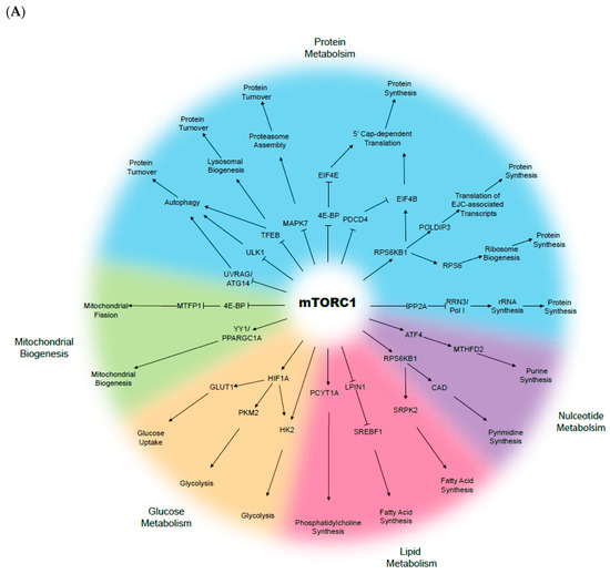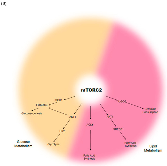 Biological functions of the mammalian target of rapamycin (mTOR): (A) mTOR complex 1 (mTORC1) and (B) mTOR complex 2 (mTORC2).