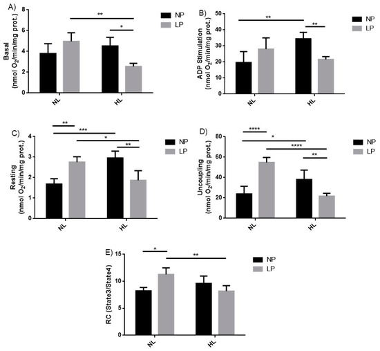 The mitochondrial respiration during basal state was reduced in LP-HL when compared to LP-NL (−43.7%, p < 0.05) and NP-HL groups (−48.7%, p < 0.01) (Figure 1A); with ADP stimulated (state 3), HL diet was able to increase ADP phosphorylation (NP-NL vs. NP-HL, +43.01%, p < 0.01). However, the association of diets during different times led to a decrease in this parameter (LP-HL vs. NP-HL, −37.3%, p < 0.01) (Figure 1B). In the resting condition (state 4), there was an increase in LP-NL (+63.1%, p < 0.01) and NP-HL (+75.1%, p < 0.001) compared to respective control group (NP-NL); and a decrease in LP-HL when compared with LP-NL (−32.1%, p < 0.05) and NP-HL groups (−36.8%, p < 0.01) (Figure 1C). Similarly, on the uncoupled state, the LP-NL (+128.9%, p < 0.001) and NP-HL (+59.1%, p < 0.05) groups were higher than NP-NL; and there was a decrease in LP-HL when compared with the NP-HL (−43.0%, p < 0.01) and LP-NL (−60.4%, p < 0.001) groups (Figure 1D). Respiratory control was significantly higher in the LP-NL compared to NP-NL (+36.8%, p < 0.05) and lower between the LP-HL group compared with the LP-NL group (−25.7%, p < 0.01) (Figure 1E).