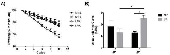 Evaluation of mitochondrial swelling in adult rats subjected to the low protein diet during gestation and lactation and post-weaning hyperlipidic diet. (A) Mitochondrial swelling (% of initial OD) and (B) area under the curve in mitochondria isolated from liver of 90-day-old male rats born to mothers fed a normoprotein (NP) or low protein (LP), during gestation and lactation, and normolipidic (NL) or hyperlipidic diets (HL) after weaning up to adulthood. n = 6–9 animals per group. All values were expressed as mean ± SEM. *p < 0.05 performed with two-way ANOVA followed by the Bonferroni multiple comparison test.