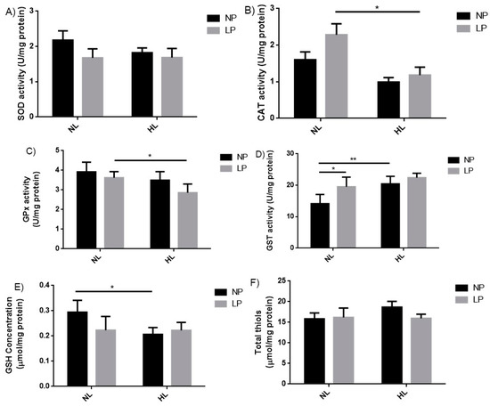 The evaluation of the enzymatic antioxidant response revealed that the nutritional manipulations did not significantly change the SOD activity (Figure 4A). However, it was observed that CAT (−48.1%, p < 0.05) and GPx (−21.0%, p < 0.05) were found reduced in LP-NL vs. LP-HL groups (Figure 4B,C, respectively). The GST activity showed an increase when comparing NP-NL with LP-NL (+38.1%, p < 0.05) and NP-NL with NP-HL (+44.5%, p < 0.01) groups (Figure 4D). HL diet led to a decrease in GSH levels in NP-HL (−29.7%, p < 0.05) related to control group (NP-NL) (Figure 4E). There was no significant change in the total thiol levels (Figure 4F).