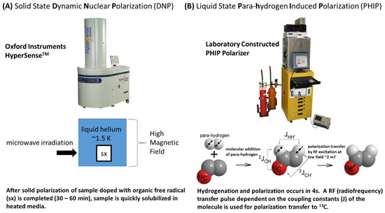 Schematic illustration of (A) DNP and (B) PHIP techniques.