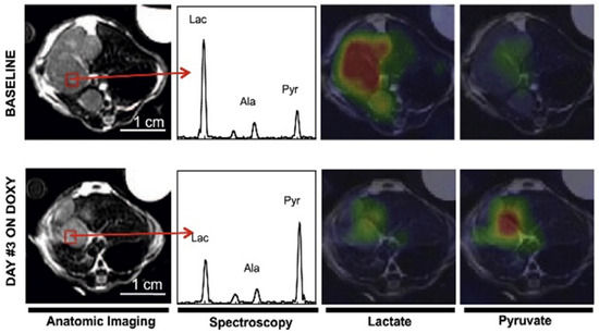 A representative example showing the application of hyperpolarized MRI and MRS in assessing response in liver tumor before and 72 h after MYC inhibition by Doxycycline (DOXY). A decrease in lactate is observed in the indicated voxel shown in red. Adapted from Reference [23] with permission.