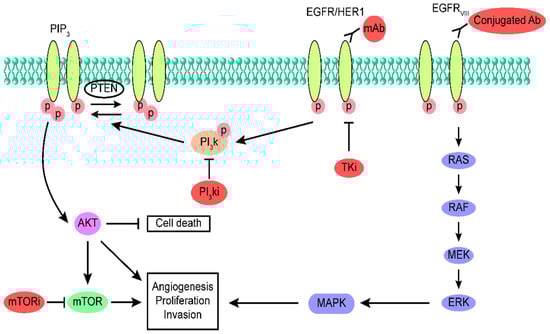 To overcome this resistance, various strategies have been proposed, including monoclonal antibodies. Currently, patients are administered monoclonal antibodies, which directly bind to mutated EGFR []. These antibodies can be classified into blocking antibodies, which inhibit binding of ligand and can be receptor non-activating or activating and stimulate internalization or not. The blocking and internalized antibodies are considered ideal for suppressing receptor activity. To date, many antibodies have been developed against EGFR to treat glioblastoma patients. The EGF blocker cetuximab, first used for colorectal cancer, is an antibody that blocks binding of ligand without receptor activation []. Patel and co-workers [] demonstrated that cetuximab can successfully bind to both EGFR and its variant EGFRvIII in U87MG cells. Further, cetuximab–EGFRvIII internalizes from the cell surface. This internalization then leads to a decrease in the phosphorylated form of the EGFRvIII receptor in transfected cells and a significant reduction in proliferation of cells.