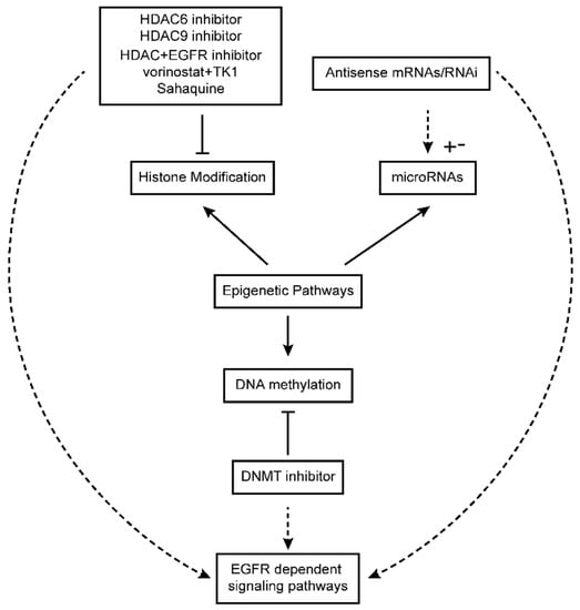 Despite great advancements over the past decade in targeting EGFR in glioblastoma using synthetic products, there is still considerable room for further progress. It has been shown that most glioblastoma patients show little or no response to therapy using EGFR inhibitors, which suggests an intrinsic resistance against these inhibitors. Even in those patients who do achieve an obvious cancer response to clinically used EGFR inhibitors, most will ultimately display progression and development of this disease, which implies developed resistance in these patients. Epigenetic modification is also a contributing factor in the development of resistance against EGFR inhibitors in cancer patients. Thus, alternative approaches such as epigenetic drugs are considered good options to overcome resistance problems in patients. Many epigenetic drugs are undergoing clinical trials and some of them have already been approved for glioblastoma treatment by the European Medicines Agency and the Food and Drug Administration []. Targeting epigenetic regulators in glioblastoma can also modulate the activity of EGFR and its associated pathways (Figure 2). Treatment with epigenetic regulators or in combination with EGFR inhibitors represents a new hope for treatment of glioblastoma [,,,].