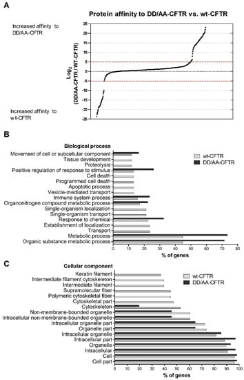 Differential protein interactions detected for DD/AA-CFTR versus wt-CFTR. (A) Log2 plot of the protein abundance ratio for DD/AA-CFTR versus wt-CFTR. Proteins were identified by LC-MS/MS, and black dashed lines indicate the threshold (log2 = ±5). Experiments were performed in triplicate (N = 3). GO analysis for differential interactors of DD/AA- versus wt-CFTR. (B) Biological process and (C) cellular component represented for DD/AA-CFTR and wt-CFTR using Database for Annotation, Visualization and Integrated Discovery (DAVID). From the total of 1150 proteins, the 161 with more affinity to DD/AA-CFTR and the 77 with more affinity to wt-CFTR were used to find the GO term biological process enriched in both subsets. p-value < 0.05.