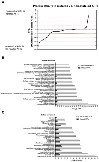 Differential protein interactions detected for peptides mimicking wt- and mutated AFT motifs. (A) Pull-down of proteins from cystic fibrosis bronchial epithelial (CFBE) parental cells that bind to non-conjugated beads (control) and beads conjugated to peptides corresponding to mutated and non-mutated AFTs. In total, 3393 proteins were identified by the LC-MS/MS method. AFT interactors were quantified using intensity-based absolute quantification (iBAQ) values and compared using the ratio log2(mutated AFT interactors/non-mutated AFT interactors); −5 ˂ log2 ˂ 5 were considered non-specific proteins. Experiments were performed in triplicate (N = 3). (B) Biological process and (C) cellular component of proteins with increased affinity to mutated vs. non-mutated AFTs. DAVID was used to evaluate the enriched GO terms in the 114 proteins with increased affinity to mutated vs. 742 proteins with increased affinity to non-mutated AFTs. −log10(p-value) was considered to evaluate the statistical significance for all categories.