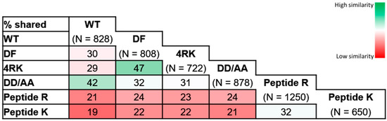 Similarity index for protein interactors. Heat map of the Jaccard similarity indices for the indicated pairwise comparisons. Number of genes in the interactome list indicated in the horizontal row in common with the interactome shown at the top (WT: wt-CFTR interactome, DF: F508del-CFTR interactome, 4RK: F508del-4RK-CFTR interactome, DD/AA: DD/AA-CFTR interactome for full-length CFTR and Peptide R and K interactomes). % shared (similarity) was obtained using the Jaccard similarity index.