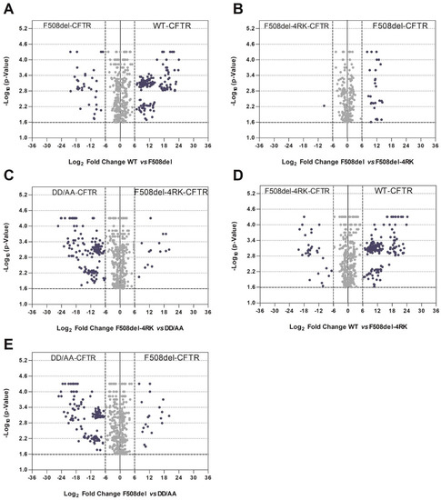 Volcano plots for pairwise comparisons of full-length CFTR variants. Significance is represented by −log10 p-value calculated using permutation tests (10,000 permutations), and the protein affinity for the two variants under analysis is assessed as described in the text. Blue dots represent hits selected based on p-values < 0.025 and |fold change| >6. A–E: Pairwise comparisons as indicated in the figure.