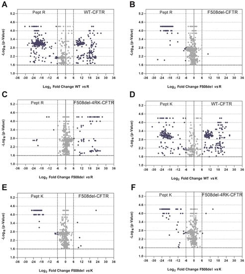 Comparison of our datasets with one of the most comprehensive CFTR interactomes [15] showed major overlap, that is about 34%, 42%, and 76% for the pairs F508del/F508del-4RK, WT/DD/AA, and PeptR/PeptK, respectively, a relevant figure considering the methodological differences.
