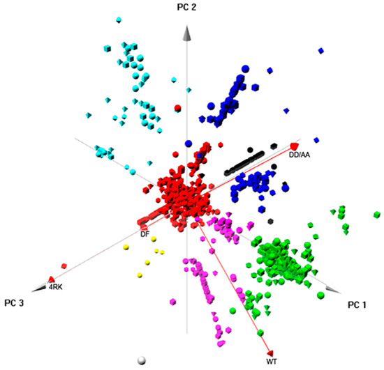 We first analyzed the set of proteins interacting with the four full-length CFTR variants (WT, F508del, F508del-4RK, and DD/AA) using as above the subtraction of the log2 of the medians of the amount of a protein isolated in two different variants. The results are shown in Figure 6; in this analysis, the first two components explain 96% of the differences in the samples; the third adds a further 3%; and the fourth the remaining 1%. Clustering was performed with HAC using hclust heuristics. The total number of proteins clustered into eight different groups (see Materials and Methods), and the red arrows represent the four CFTR variants under consideration. Results showed that F508del, F508del-4RK, and DD/AA aligned in the same axis with the same direction. DD/AA and WT aligned through PC1 axis although with a different PC2 direction.