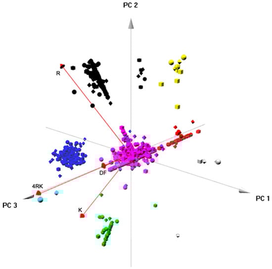 We performed a similar analysis comparing the protein lists related to regulation of CFTR ER exit by the AFTs (full-length F508del- and F508del-4RK-CFTR plus PeptR and PeptK). The results (Figure 7) showed that, as above, the first two components explained 96% of the differences in the samples; the third added a further 3%; and the fourth the remaining 1%. The total number of proteins clustered into eight different groups for which bioinformatics analysis was then performed (Table S4). As above, the large central cluster (purple) was most likely a cluster of non-distinctive genes, where no observable differences among variants has been discerned. The black cluster (180 genes) showed dominance of proteins annotated to metabolic processes (BP). The red cluster (48 proteins) was enriched in proteins related to RNA processing and translation initiation (BP). The green cluster (34 proteins) grouped proteins enriched with terms actin filament or organelle/complex assembly/organization (BP). The blue cluster (178 proteins) included proteins with terms related to RNA splicing, but also cytoskeleton (BP). The cyan cluster, although quite small (11 proteins), was enriched in terms related to protein folding and modification (BP). The yellow cluster (15 proteins) was enriched in cytoskeleton- and microtubule-related terms (BP). Finally, the grey cluster (only five proteins) was enriched in terms related to ion or mitochondrial transport (BP). Overall, this analysis identified seven main categories: metabolic processes; RNA processing and translation; complex assembly and organization; RNA splicing; protein folding; cytoskeleton and microtubules; and ion/mitochondrial transport. As above, and among these clusters, we were able to identify protein–protein interaction networks (Figure S6). Compared to the PCA described above, in this case, protein folding was evidenced as a distinctive category, which was absent when the full-length variant interactomes were compared.