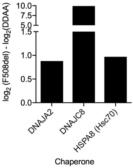 Association of f508del-CFTR with chaperones compared to DD/AA-CFTR. The protein affinity for the two variants under analysis was assessed by calculating log2(Condition 1) − log2(Condition 2)| and shown for variants with −log10(p-value) ≥ 1.6 (corresponding to p < 0.025) as in Figure 4 (see Materials and Methods).