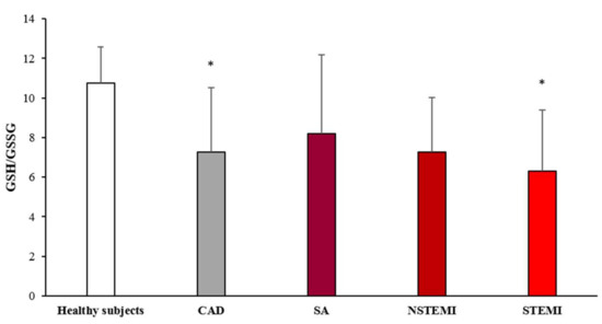 GSH/GSSG evaluation in monocyte-derived macrophages (MDMs). MDMs were obtained from CAD patients and healthy subjects. Data are expressed as mean ± SD and derive from independent cultures obtained from 10 healthy subjects and 30 CAD patients (SA n = 10; NSTEMI n = 10; STEMI n = 10. * p < 0.05 vs. healthy subjects.