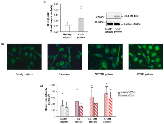 HO-1 levels in CAD patients and healthy subjects. (a) The protein levels of HO-1 were detected by western blot analysis. β-actin was used as a control of protein loading. Densitometry is shown in the bar graph. Data are expressed as mean ± SD and derive from MDMs obtained from 10 healthy subjects and 17 CAD patients. (b) Representative images of HO-1 in round and spindle MDMs obtained from healthy subjects and CAD patients (400× original magnification), nuclei were visualized by Hoechst 33258. (c) Quantitative analysis of HO-1 in round and spindle MDMs. Data are expressed as mean ± SD of fluorescence intensity/µm2 (at least three fields, 400× magnification, were analyzed) and data derive from independent cultures obtained from 10 healthy subjects and 30 CAD patients (SA n = 10; NSTEMI n = 10; STEMI n = 10. # p < 0.05 vs. round; * p < 0.05, ** p < 0.01, *** p < 0.001 vs. healthy subjects.