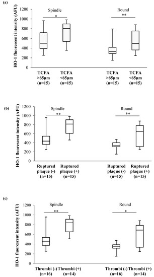 Patients with high levels of HO-1 in both MDM morphotypes more frequently displayed a TCFA (p = 0.049 and p = 0.015, spindle and round, respectively) (Figure 4a), a ruptured plaque (p = 0.001 and p = 0.036, spindle and round, respectively) (Figure 4b), and presence of thrombi (p = 0.0005 and p = 0.028, spindle and round, respectively) (Figure 4c).