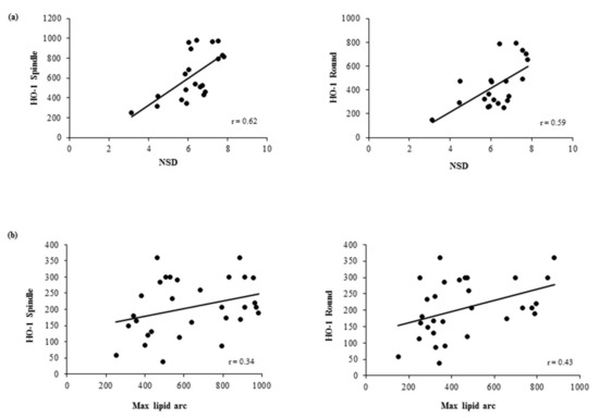 In addition, in both MDM morphotypes we observed significant positive correlations between HO-1 levels and macrophage content (NSD) (spindle: r = 0.62, p = 0.003; round: r = 0.59, p = 0.005) (Figure 5a). Moreover, borderline positive correlations were observed between HO-1 levels and max lipid arc (spindle: r = 0.34, p = 0.06; round: r = 0.43, p = 0.02) (Figure 5b).