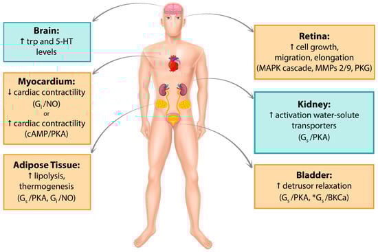 | Urinary System | Bladder | Yes | Yes | Bladder relaxation | Gs (cAMP/PKA) | Treatment of Overactive bladder syndrome | Mirabegron Solabegron Vibegron | Approved Phase II Phase III |