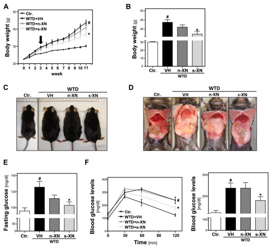 After 3 weeks, BW was already significantly increased (25.8 ± 0.7 g vs. 29.2 ± 1.9; p = 0.0001). At this time, we started to treat 2 groups of WTD-fed animals with either s-XN or n-XN in a daily dose of 2.5 mg/kg BW by oral gavage. The third group of WTD-fed mice (WTD-VH) and control mice (CTR) received vehicle (VH) only. In the WTD-VH group, the body weight continued to increase significantly over time as compared with mice fed control chow (Figure 1a). After 11 weeks, WTD-fed mice appeared obese and showed a marked enlargement of both visceral and subcutaneous adipose tissue (Figure 1c,d). This body weight gain was significantly inhibited by application of s-XN, while n-XN exhibited only a slight effect (Figure 1a,b). Also, enlargement of adipose tissue appeared less pronounced in WTD-mice receiving s-XN (Figure 1d). No significant differences were found between treatment groups regarding food and fluid intake throughout the study (data not shown).