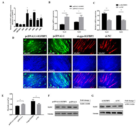 Insulin-like growth factor binding protein 2 (IGFBP2) is a member of the IGFBPs (IGFBP1-6) family. These six homologous proteins are famous for their high-affinity binding to IGF1 and IGF2 [19]. IGFBP2 can participate in many different kinds of cancer as a potential biomarker [20]. Previous research has found that IGFBP2 was abundantly expressed in the eyes, brain, skeletal muscle, and heart of chickens during the embryonic period [21], and highly expressed in embryonic tissues in mammals [22]. The DNA polymorphism of IGFBP2 was significantly correlated with growth, carcass, meat quality, and reproductive traits of pigs [23,24]. However, in addition to the above studies, few reports have been made about IGFBP2 in poultry skeletal muscle development.