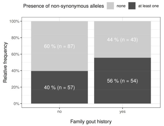 Regarding family history, patients with non-synonymous variants had familial gout in 54 of 111 cases (48.6%), whereas patients who did not have non-synonymous variants had familial gout in 43 of 130 (33%) cases (Figure 1). This association was statistically significant (odds ratio = 1.91, 95% CI: 1.10, 3.34; P = 0.0176, Fisher’s exact test). Considering that a previous study with a small cohort had found only borderline significance (P = 0.053) for this association [], our result can be considered to be a strength of this study. As previously described, these findings suggest the epidemiological importance of ABCG2 common and rare variants for gout/hyperuricemia risk in the Czech population, supporting a “Common Disease, Multiple Common and Rare variant” hypothesis for the association between ABCG2 and gout, which was proposed in our previous study on Japanese gout patients [].