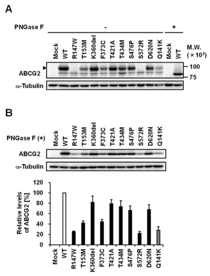 To investigate the effect of each non-synonymous mutation in the ABCG2 gene on the intracellular processing and function of ABCG2 protein, we transiently expressed ABCG2 WT and its nine variants (R147W, T153M, K360del, F373C, T421A, T434M, S476P, S572R, and D620N) in 293A cells. Each expression vector was prepared using a site-directed mutagenesis technique from an ABCG2 WT/pEGFP-C1 plasmid and confirmed by DNA sequence. To address the former topic, we first performed immunoblot analyses using the anti-EGFP antibody for the detection of EGFP-tagged ABCG2. The results revealed that the R147W and S572R variants did not produce a matured glycoprotein (Figure 3A). Moreover, using N-glycosydase (PNGase F)-treated whole cell lysates, we compared the levels of ABCG2 protein in the cells among the variants and WT (Figure 3B). Since the Q141K variant reportedly reduces ABCG2 protein level [,,], we employed this variant as a control in this study. The reducing effect of Q141K on the ABCG2 protein level detected in the present study (Figure 3) was almost comparable to that in a previous study [] which, like us, also used a similar transient expression strategy to validate ABCG2 mutations in vitro. This consistency supports the reliability of the following results. Semi-quantitative evaluation of immunoblot signals showed that each variant decreased the levels of ABCG2 protein; the R147W and S572R variants showed significant effects (<25% of WT), the T153M and F373C variants had profound effects on reducing ABCG2 protein level (<50% of WT), and the other variants only mildly affected the protein expression of ABCG2.