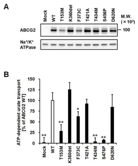 3.5. Effect of Each Mutation on the Urate Transport Activity of ABCG2 Protein