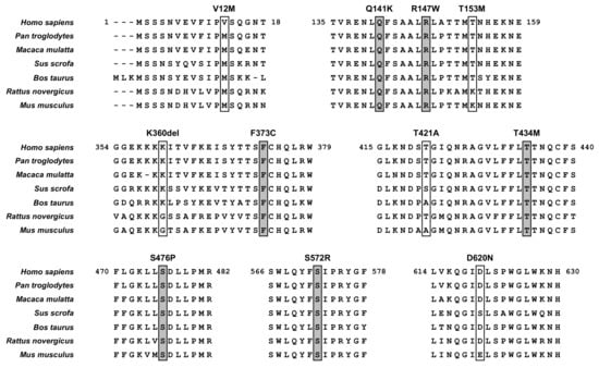 Additionally, our findings provide insights into the amino acid positions that are important for ABCG2 function. Interestingly, in null or approximately null variants of ABCG2, the original amino acids (R147, T434, S476, and S572) are conserved with several major mammalian species (Figure 6). Among them, R147 is close to Q141, while the others are in transmembrane domains (Figure 2). Given that the Q141K and R147W variants decreased the protein levels of ABCG2 (Figure 3), peptides around these two amino acids might be important for the stabilization of ABCG2 protein. Since the S572R variant likewise diminished ABCG2 protein levels (Figure 3), the S572 residue, which is located in the boundary region between helices 5b and 5c (Figure 2), may be important. Interestingly, a previous study reported that an artificial mutation I573A (a neighbor position of S572) disrupted maturation and reduced plasma membrane localization of ABCG2 protein [], which could support the biochemical importance of the boundary region in the intracellular stability of the ABCG2 protein. Regarding T434 and S476, there is a possibility that these amino acids might be involved in the formation of a penetrating pathway for ABCG2 substrates or may be critical for the dynamics of the function of the ABCG2 transporter.