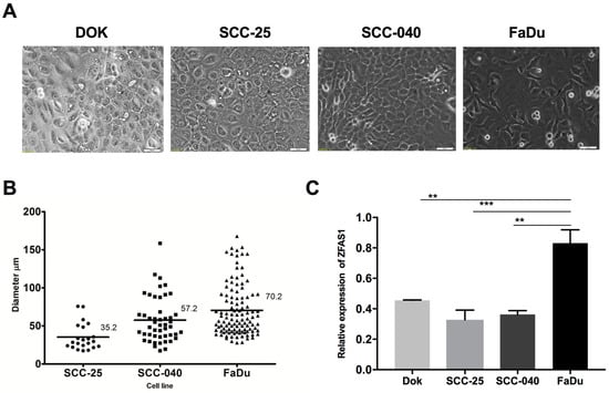 (A) Microscopic pictures of dysplastic oral keratinocyte (DOK), SCC-25, SCC-040, and FaDu cell lines, magnification 20×; (B) the capacity of spheres forming and (C) expression level of ZFAS1 lncRNA presented as mean with SEM; one-way ANOVA; ** p < 0.01, *** p < 0.001.