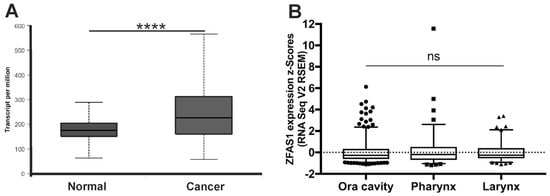 The expression level of ZFAS1 in head and neck squamous cell carcinoma (HNSCC) patients. (A) Expression in normal (n = 44) and cancer (n = 520) tissues; (B) Expression depending on HNSCC localization (n = 520); Graphs from UALCAN database, modified; Un-paired T-test; the graphs show mean of value presented as transcripts per million; and box and whiskers with 5–95 percentile, one-way ANOVA obtained using Dunn’s multiple comparisons tests; ns—no significant, **** p < 0.0001.