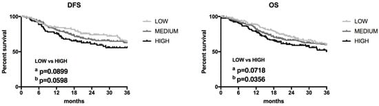 HNSCC samples were divided into low, medium, and high ZFAS1 expression groups using the <25, 25–75 and >75 percentile of ZFAS1 expression as a cutoff, respectively. We observed a slightly longer DFS of low ZFAS1 expression patients compared to the high expression group (p = 0.0598; HR = 0.6554; 95% CI = 0.4029–1.066). We also detected a slight longer OS in the low ZFAS1 expression group compared to the high group (p = 0.0356; HR = 0.6922; 95% CI = 0.4623–1.037) (Figure 3).