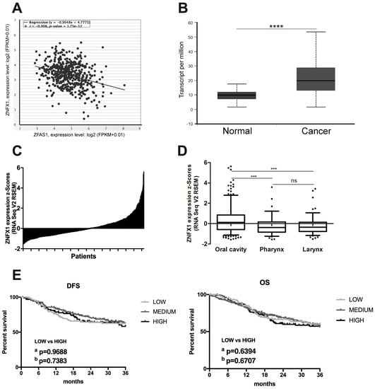 The expression level of ZNFX1 in HNSCC patients. (A) Correlation between ZNFX1 and ZFAS1 in HNSCC patients; Graph from StarBase v3.0 database, modified; (B) Expression in normal (n = 44) and cancer (n = 520) tissues; **** p < 0.0001; (C) Expression of ZNFX1 in cancer samples (n = 520); (D) Expression depending on HNSCC localization (n = 520); Graphs from UALCAN database, modified; Un-paired T-test; the graphs show mean of value presented as transcripts per million; and box and whiskers with 5–95 percentile, one-way ANOVA obtained using Dunn’s multiple comparisons tests; ns—no significant, *** p < 0.001; (E) DFS and OS in HNSCC patients with low (n = 130) and high (n = 130) expression levels of ZNFX1; a—Log-rank (Mantel-Cox) test, b—Gehan-Breslow-Wilcoxon test; p < 0.05 considered as significant.