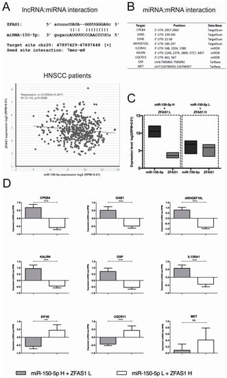 Previous reports have indicated that ZFAS1 acts as a molecular sponge by targeting miRNAs, such as miR-9, miR-150, miR-484 or miR-200b/c, and reducing their activity in the cell [47]. Base on StarBase v3.0, the possible interaction between ZFAS1 and miRNAs was analyzed. In the case of miR-150-5p, an interaction between miRNA and ZFAS1 (ENSG00000177410) was observed: target site, chr20 47897429-47897448 [+]; seed site interaction, 7mer-m8. Moreover, between ZFAS1 and miR-150-5p, we detected a negative correlation (r = −0.116, p = 0.0098) in HNSCC patients (Figure 5A).