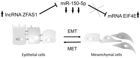The direct regulation mechanism of mRNAs by lncRNA ZFAS1 remains unknown. However, some previous reports have indicated that ZFAS1 can act as a molecular sponge and reduce the abundance of miRNAs, such as miR-9, miR-150, miR-484 or miR-200b/c, and reduce their activity in the cell and have an indirect influence on mRNAs [47]. We analyzed this possible mechanism and indicated that, indeed, a sequence of ZFAS1 possesses the binding site for miR-150-5p. Moreover, the negative correlation between ZFAS1 and miR-150-5p was observed in HNSCC patients. Next, we checked if, in the group of genes associated with ZFAS1, any targets for miR-150-5p are present. We found nine potential mRNAs targets, CPEB4, GAB1, ARHGEF10L, KALRN, DSP, IL13RA1, EIF4E, UQCR11, and MET. Only UQCR11 and EIF4E were significantly down-regulated in the group of patients with high level of miR-150-5p and low ZFAS1, which supports our assumption of direct regulation by miR-150-5p. There is no association between the UQCR11 (ubiquinol-cytochrome c reductase, complex III sub-unit XI) gene and cancer. However, the second gene, eukaryotic translation initiation factor 4E (EIF4E), is activated in cancers [49] and is required for translation of some mRNAs involved in proliferation and survival [50], as well as in EMT process and cancer invasion [51,52]. The phosphorylation of EIF4E is very frequently observed in HNSCC [49]. Moreover, EIF4E is up-regulated in surgical margins of HNSCC patients with local recurrence and could serve as a prognostic biomarker [53]. DeFatta et al. indicated that the FaDu cell line displays a high EIF4E protein level and that this is similar to the level observed in patients. Knock-down of EIF4E results in suppression of the tumorigenic and angiogenic properties of the FaDu cell line manifested by loss of capacity to grow in soft agar, reduced expression of angiogenic factors (FGF-2 and VGF), and loss of tumor growth in nude mice [54]. The FaDu cell line has the highest ZFAS1 level among HNSCC cell lines, and our results suggest that ZFAS1 reduced the level of suppressor miR-150-5p and maintained a high level of EIF4E. It seems likely that the oncogenic EIF4E, in turn, up-regulates expression of some genes associated with EMT metastasis and could result in poor patient outcome (Figure 6). However, the above hypothesis needs to be further verified by in vitro and in vivo analysis of ZFAS1 function in HNSCC.