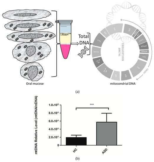 The oral mucosa sample is a reliable tissue for assessing mtDNA levels in children with ASD. Furthermore, from this sample, it was possible to extract RNA for the evaluation of gene expression and proteins, which opens the door for new research possibilities in ASD or other diseases that are difficult to have access to or which make for risky blood samples.