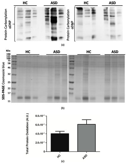 Oral mucosa total protein oxidation levels in Chilean children with ASD. (a) Total proteins were isolated from oral mucosa cells by TRIzol™ reagent (Invitrogen) and fractionated by SDS-PAGE (sodium dodecyl sulfate-polyacrylamide gel electrophoresis). Protein carbonylation was detected with the Oxyblot Protein Detection Kit. αDNP: Anti-2,4-dinitrophenylhydrazone antibody. (b) SDS-PAGE Coomassie blue staining of SDS-PAGE of derivatized proteins. (c) Densitometry quantification of protein carbonylation was made with the ImageJ software. Carbonylation of proteins was normalized by Coomassie blue staining. Each bar represents the mean ± SEM, analyzed by unpaired t-test. Healthy controls (HC), n = 11 and ASD children, n = 11.